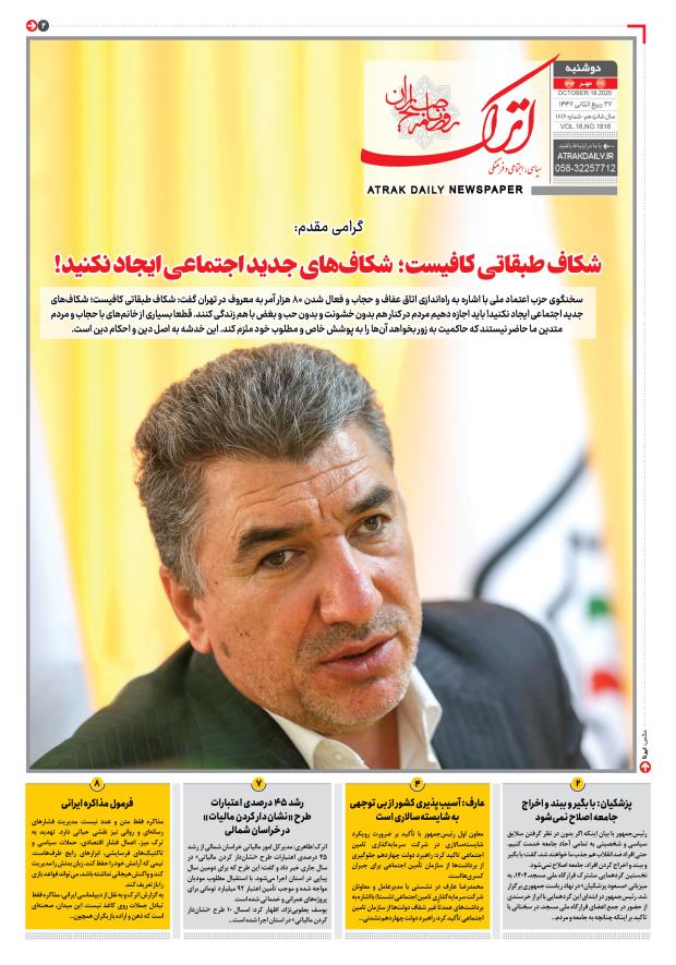 گرامی مقدم: شکاف طبقاتی کافیست؛ شکاف‌های جدید اجتماعی ایجاد نکنید!پزشکیان: با بگیر و ببند و اخراج، جامعه اصلاح نمی‌شودعارف: آسیب‌پذیری کشور از بی توجهی به شایسته‌سالاری استرشد ۴۵ درصدی اعتبارات طرح‌ «نشان‌دار کردن مالیات» در خراسان شمالیفرمول مذاکره ایرانی