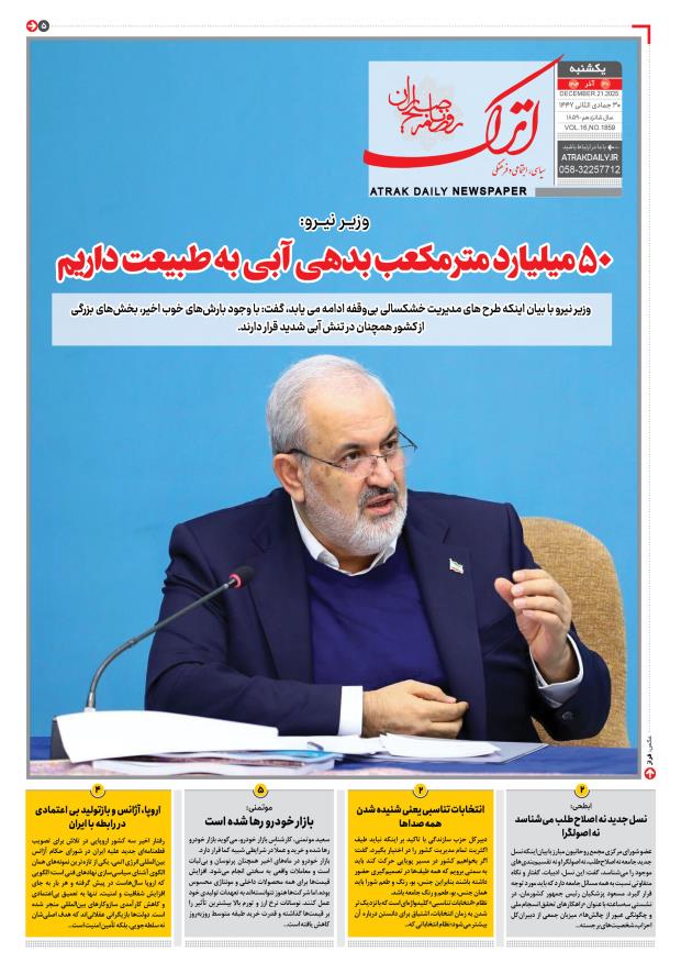 وزیر نیرو: ۵۰ میلیاردمتر معکب بدهی آبی به طبیعت داریمابطحی: نسل جدید نه اصلاح‌طلب می‌شناسد نه اصولگراانتخابات تناسبی یعنی شنیده شدن همه صداهاموتمنی: بازار خودرو رها شده است